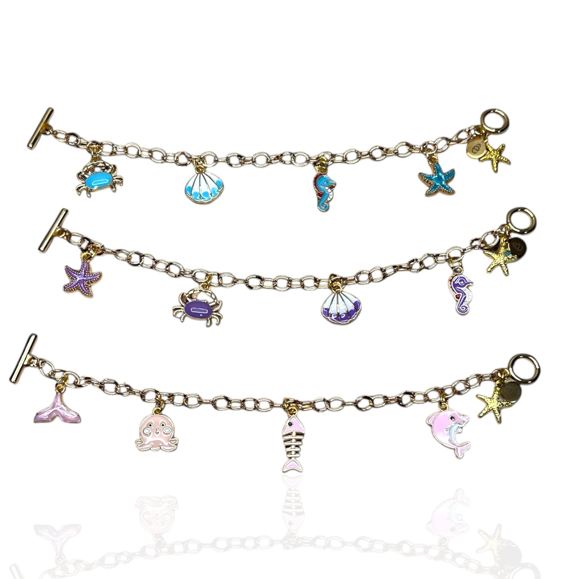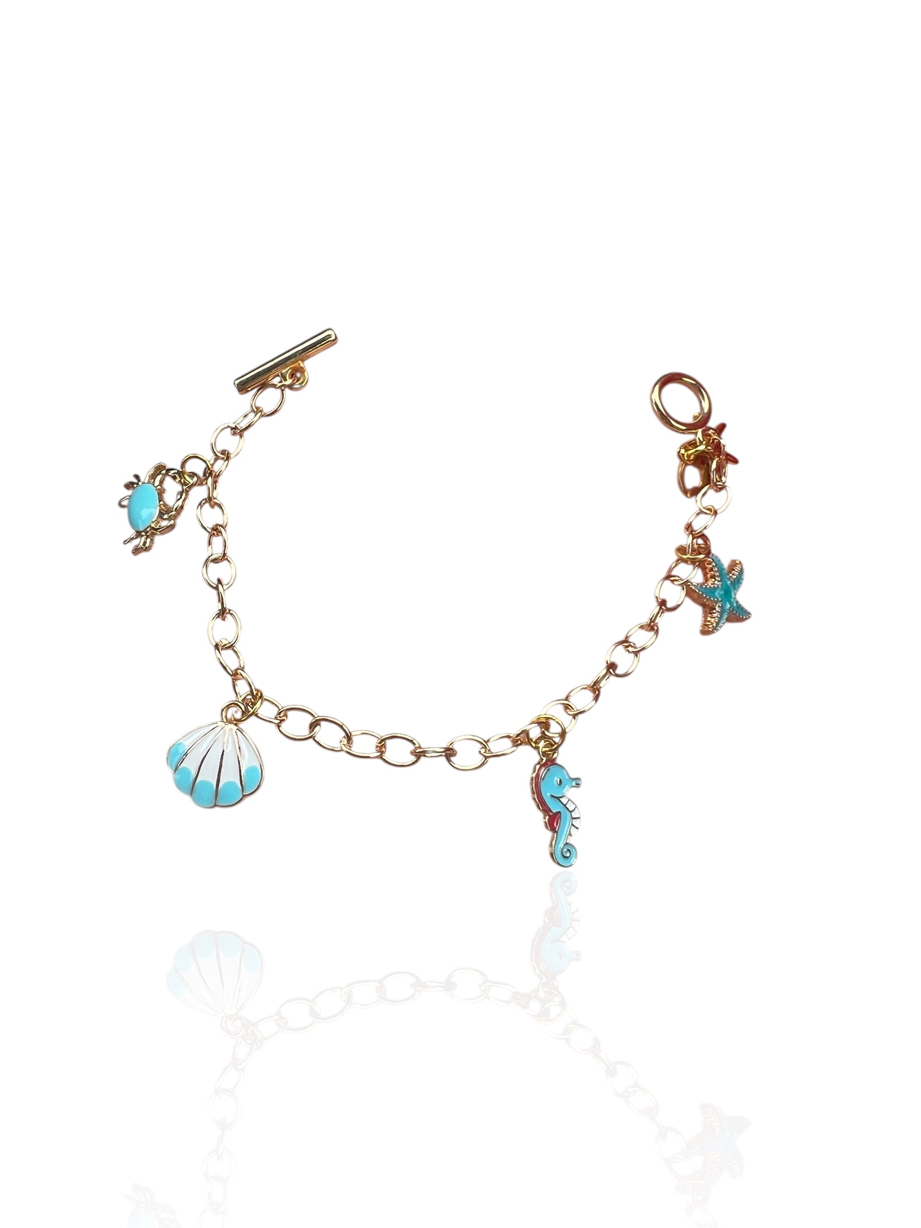 Su diseño incorpora delicados charms que representan algunos de los habitantes más emblemáticos del océano: un caballito de mar que simboliza la calma y el equilibrio, una estrella de mar como guía en los momentos de cambio, una concha cargada de historia, y un cangrejo, guardián de los tesoros del mar.