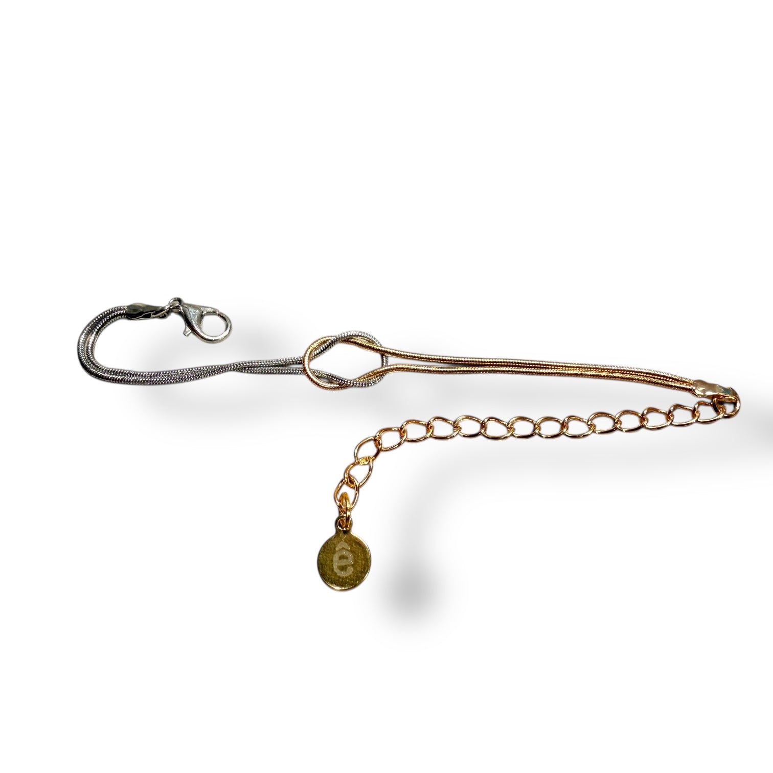 Pulsera de cadena-cordón bicolor en dorado y plateado con nudo infinito. Infinity representa la eternidad, la unión y el equilibrio.